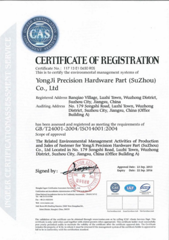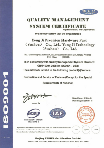 永基相继取得了ISO9001:2008,ISO14001:2004,TS16949:2009等体系证书。我们视质量为企业发展的生命线,按照“优质高效、计划管理”,不断提高产品标准,始终以高于行业标准来进行产品生产。