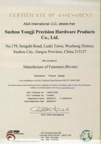 永基相继取得了ISO9001:2008,ISO14001:2004,TS16949:2009等体系证书。我们视质量为企业发展的生命线,按照“优质高效、计划管理”,不断提高产品标准,始终以高于行业标准来进行产品生产。